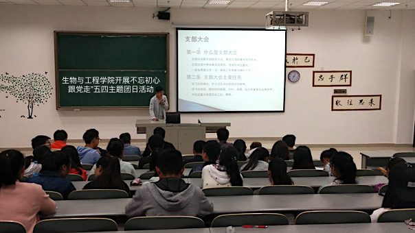 生物与工程学院于2017年4月13日,在7502教室由2016级化学生物学班团支书石业陶讲解,生物与工程学院约200余名团员参与开展“不忘初心跟党走”五四主题团日活动。